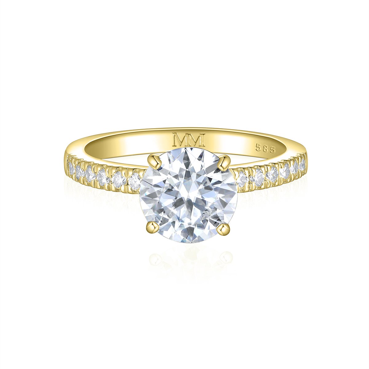 Verlovingsring in 18k geelgoud met een moissanite als centrale steen en zijstenen. De centrale steen is rond van vorm en het gewicht is 7 karaat.